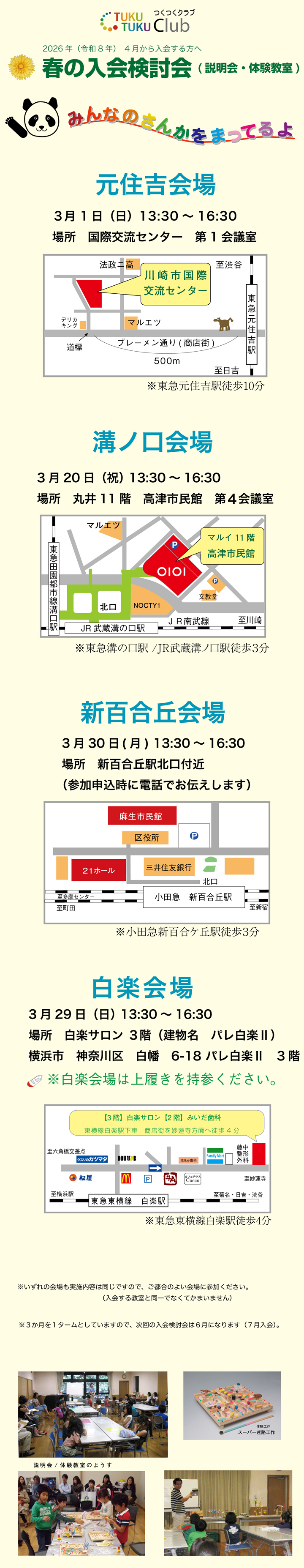 つくつくクラブは、3か月を1タームとしていて、春期(4.5.6月)、夏期(7.9月、8月はお休み)、秋期(10.11.12月)、冬期(1.2.3月)に分かれています。入会検討会はそれに合わせ、その前月ころに実施します(通常、3月は全教室で、その他の月は空席状況に応じて1-2か所の会場で実施します。