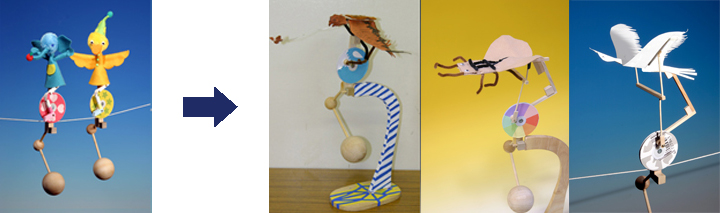 バランス一輪車は、ヤジロベエの原理を使った一輪車で、糸の上をバランスよく綱渡りする。一輪車と名前がついているように一輪車を制作し、その上に手作りのかわいい人形を乗せる。一輪車の人形は女の子に人気があるが、人形のイメージが強く、男の子に人気がない。そこで、今回は、かわいい人形ではないものを作ろうということになった。