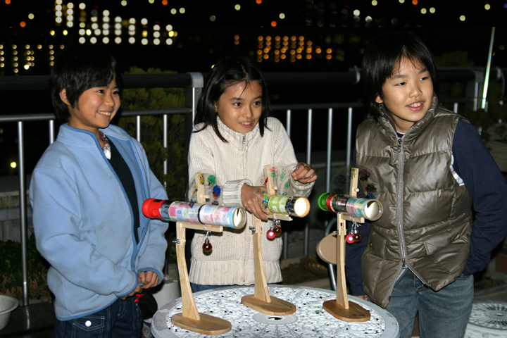 最初にレンズの仕組みについて実験をしました。レンズが像を結ぶ様子や、像がさかさまに映ることを理解して工作の開始です。投影機ができあがると、今度は上映するフィルムにマジックで絵を描きました。