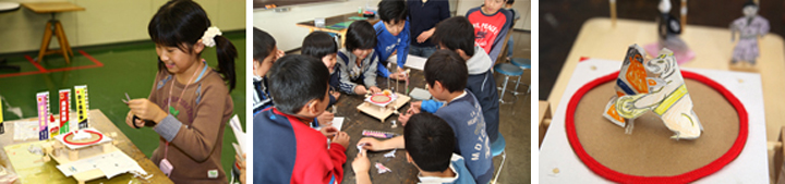 紙相撲は楽しい遊びですが、自分の力士を勝たせるために熱くなって土俵をたたきすぎたりして、今ひとつ公平な取り組みになりません。そこで、つくつくクラブでは、科学工作教室らしく、クランクハンドルとカムを組み合わせた土俵を作りました。ハンドルをぐるぐる回せば、土俵が揺れて相撲の取り組みができます。みんなで土俵を作ったあと、力士を作ってトーナメント戦をしました。アナログな遊びのなかにもデジタルゲームにはないキラリと光るよさがあります。
