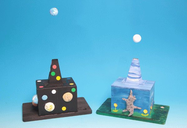 ファンを仕込んだ箱を作り、ノズルから出てくる気流でボールをフワフワと浮かしました。ここまではキリやドライバー、ボンドを使って精密に組み立てていきました。モーターの配線をして、電池をつなげました。完成してボールがふわふわと浮き上がると「やった~」と歓声が上がりました。