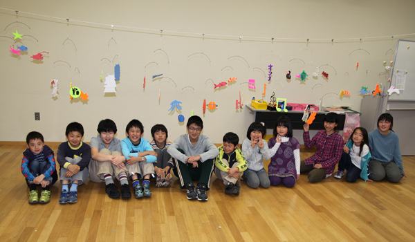 自分の好きな形にスチレンボードを加工し終えたら、細いテグス(低学年は綿糸)で作った物を結んで行きます。しかし、子どもたちは糸を結ぶことがとっても苦手です。なんとか、結んでとってもきれいなモビールができ上がりました。