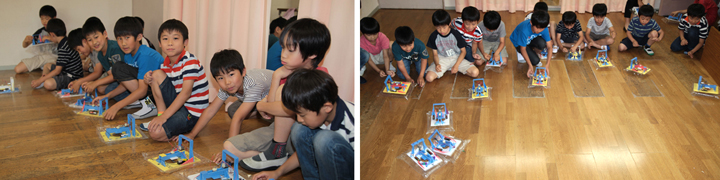 車体とコントローラーがーでき上がると、それぞれ自由に装飾しました。レーシングカーにしたり、動物にしたり、楽しいリモコンカーができ上がりました。