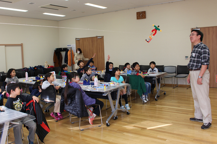 低学年にはちょっとむずかしい質問や説明をしたあと、綱渡り一輪車を作りました。