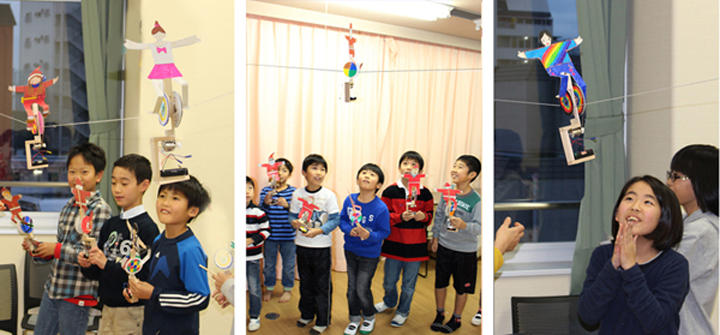 作り終えたら、ヒモを張って、綱渡りさせました。ゆらゆらゆれながらも、落ちずに綱渡りする人形にみんな、ハラハラドキドキ。 「うちに帰ったら、またやってみる!!!」。 いっぱい遊んで、いっぱい不思議を感じて、学んでほしいです。