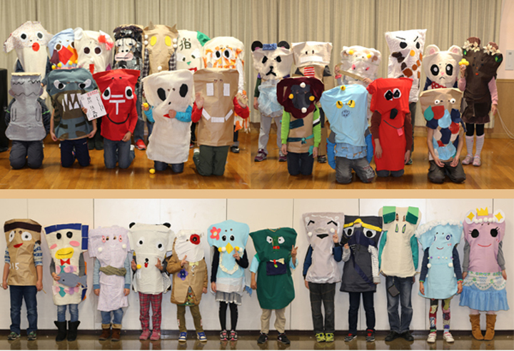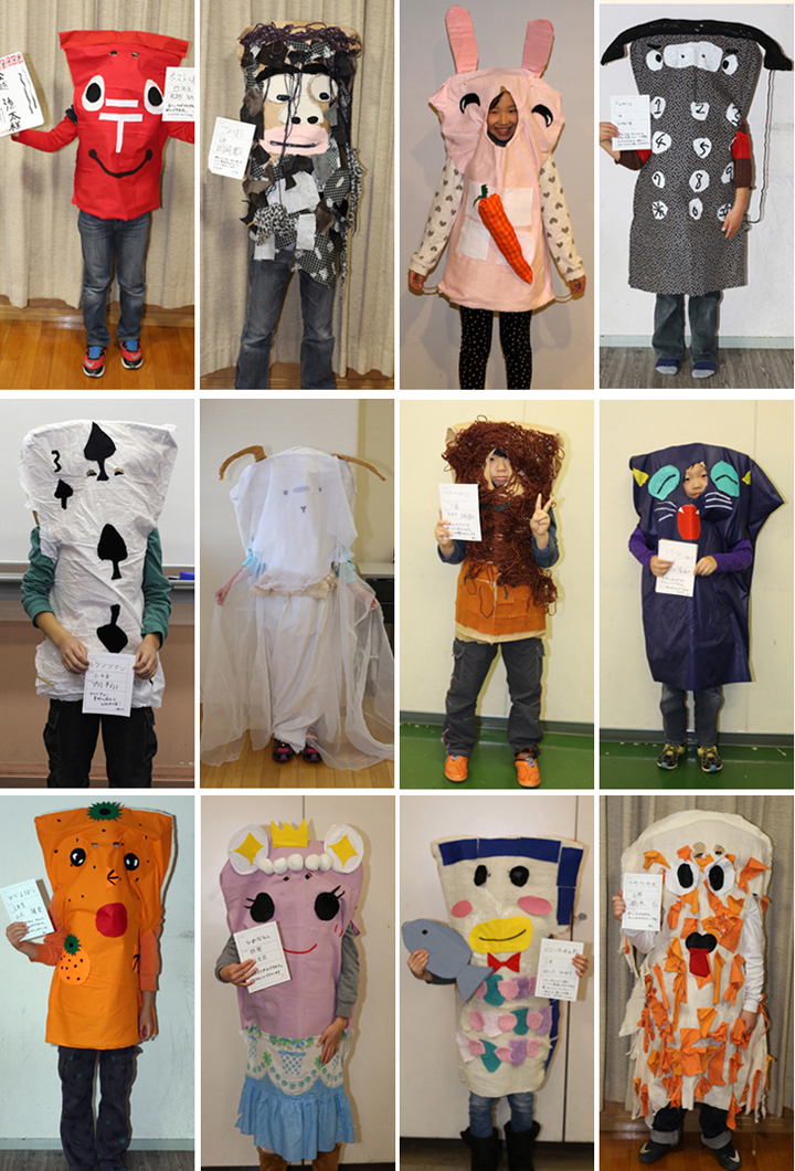つくつくクラブで初めて、布を使った造形工作をしました。布になじみのない科学工作系の男の子たちも、「ゆるキャラなら がんばる」とはりきって作りました。最初に簡単な下絵を描きました。そして、布を切ったり、裂いたり、毛糸やダンボールを使って、自分の体よりも大きな作品を作っていきました。次々に飛び出すアイデアに先生もびっくり。楽しいゆるキャラがたくさんできあがりました。さいごに、みんなでかぶって記念撮影をしました。