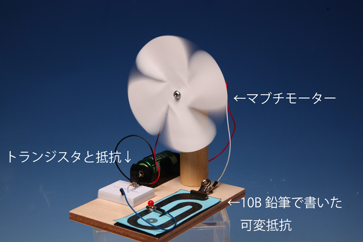 10Bの鉛筆を濃く塗って可変抵抗を作りました。可変抵抗を通った電流をトランジスタで増幅してモーターを回します。モーター軸にはチャックがついていて、いろいろな円盤を取り付けて回すことができます。
