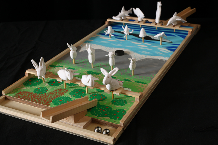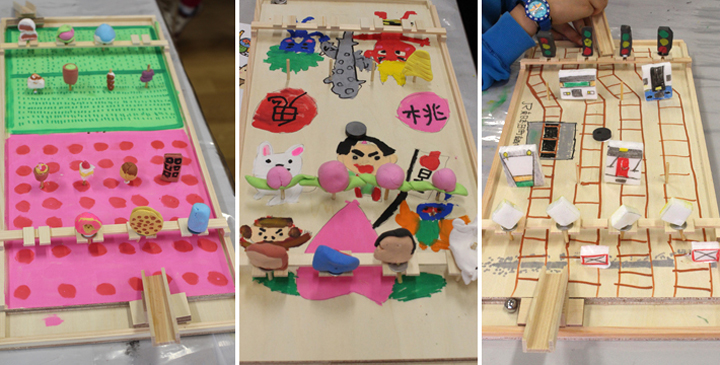 ゲームを作りました。玉を転がして相手のフィギアを倒していくオリジナルボードゲームです。どんなゲームにしたら楽しいか案を考え、大きなボードに絵を描いて、粘土でフィギアを作っていきます。子どもたちの発想はすごい。楽しいゲームがたくさんできあがりました。お家に帰ったら友だちと遊んでね。