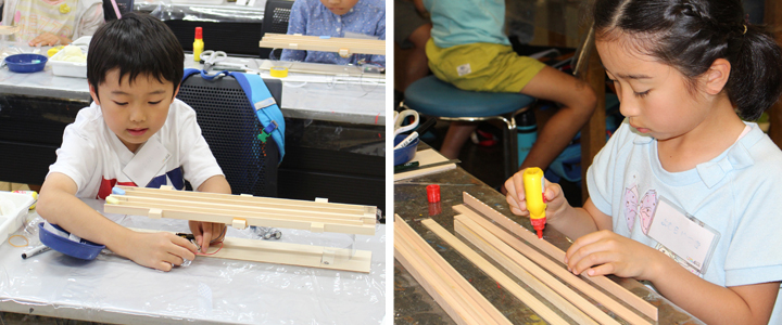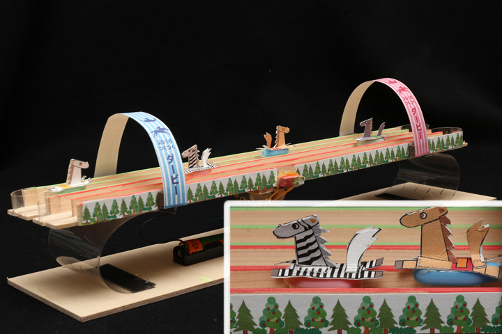 今回は、振動の勉強をしたあとに、振動の力で小さな馬たちが走り回る「振動競馬場」を作りました。コーナーはペットボトルを切った急カーブになっていて、何周でもぐるぐる回ります。早く走る馬やコーナーを回り切れない馬もいて、なかなか思い通りに走ってくれないところが面白いです。科学工作なので、物差しで測っては切るの繰り返しで低学年にはむずかしい工作でしたが頑張って作りました。