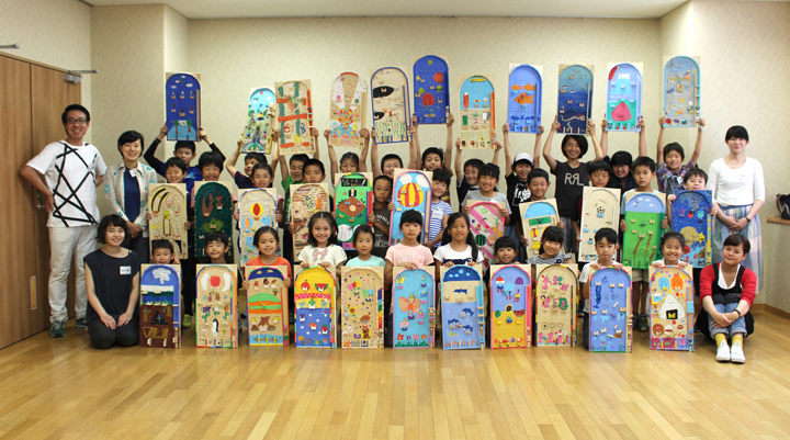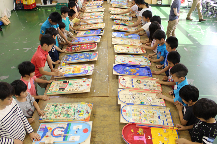 今回のテーマは「どきどき はらはら ワクワクするピンボールゲームを作ろう」です。最初に設計図を描いてデザインをしました。昆虫や宇宙、野球場をテーマにした生徒が多かったですが、読んだ本の世界や独自の世界をテーマにした生徒もいて、とても楽しいデザインになりました。