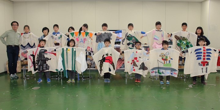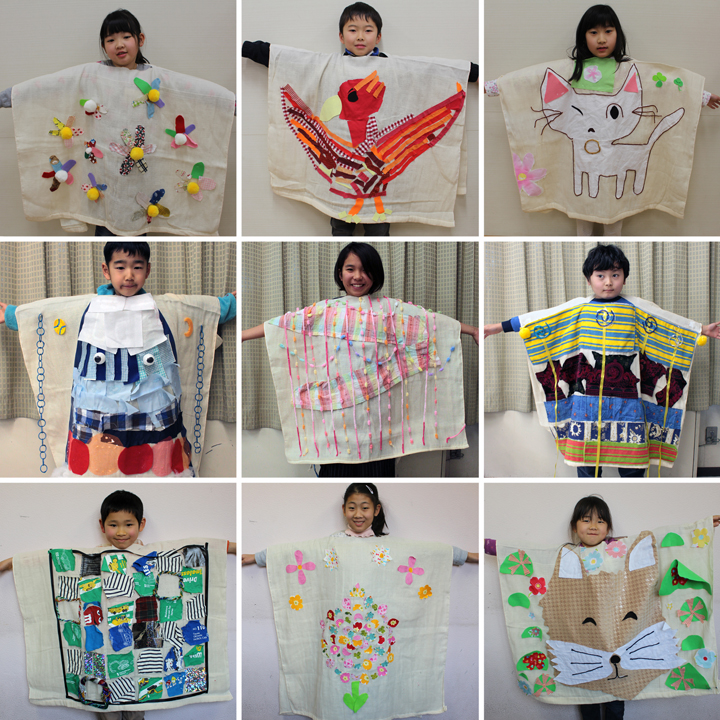 服(貫頭着・縄文服)を作りました。最初にスケッチブックにデザイン画を描き、それに基づいて布や毛糸を切って張っていきました。楽しくてかわいい服ができあがりました。