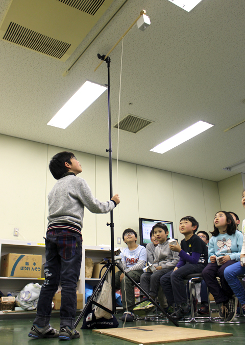 卵落としコンテストは、名古屋大学の生田幸士教授が開発した大学生向けの教育方法で、現在では、多くの大学や宇宙航空研究開発機構(JAXA)で実施されています。本来は3階の校舎(9m)から落下させるものですが、つくつくクラブではそれができないため、各教室の天井付近から落としました。