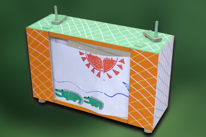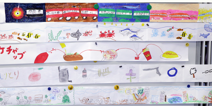 ハンドルをくるくる回して絵巻物を送る装置を作りました。みんな、とっても長い絵巻物を描いて装置に入れました。絵巻物は紙をつないでいくと、どんどん長くすることができます。楽しいお話や素敵な絵が画面に現れて、次々に流れていくのは、紙芝居のようで、とても楽しかったです。