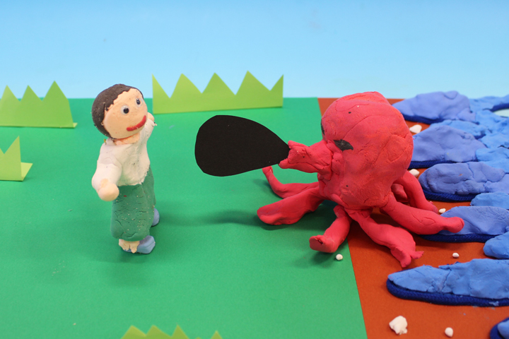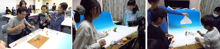 クレイアニメを作りました。色粘土を絵の具の代わりにして平面で制作するアニメを以前作ったので、今回は立体でアニメを作ってみました。10人ほどのグループに分かれ、みんなでストーリーを考えて、絵コンテを描きました。絵コンテに基づいて粘土で人形や背景を作りました。そして、いよいよ撮影です。みんなが人形を動かして、ストップモーションとしてどんどんとっていきます。最後にセリフをつけました。とても楽しい、お話がたくさんできあがりました。